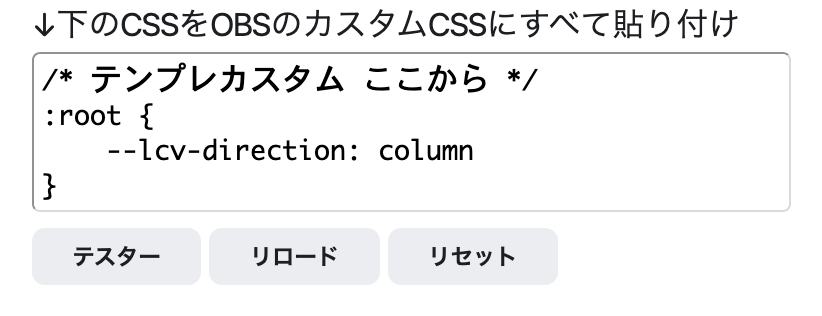 追加したテンプレートのブラウザソース設定画面を開き、先程コピーしたCSSをペーストします