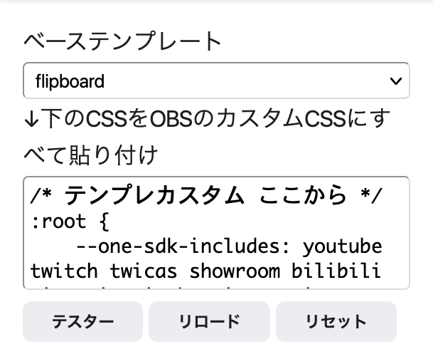 下記「OBSにコメントを出してみよう」の手順に沿ってベーステンプレートと同じテンプレートをOBSに追加します