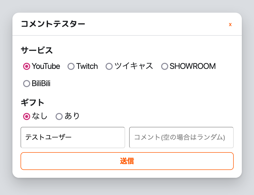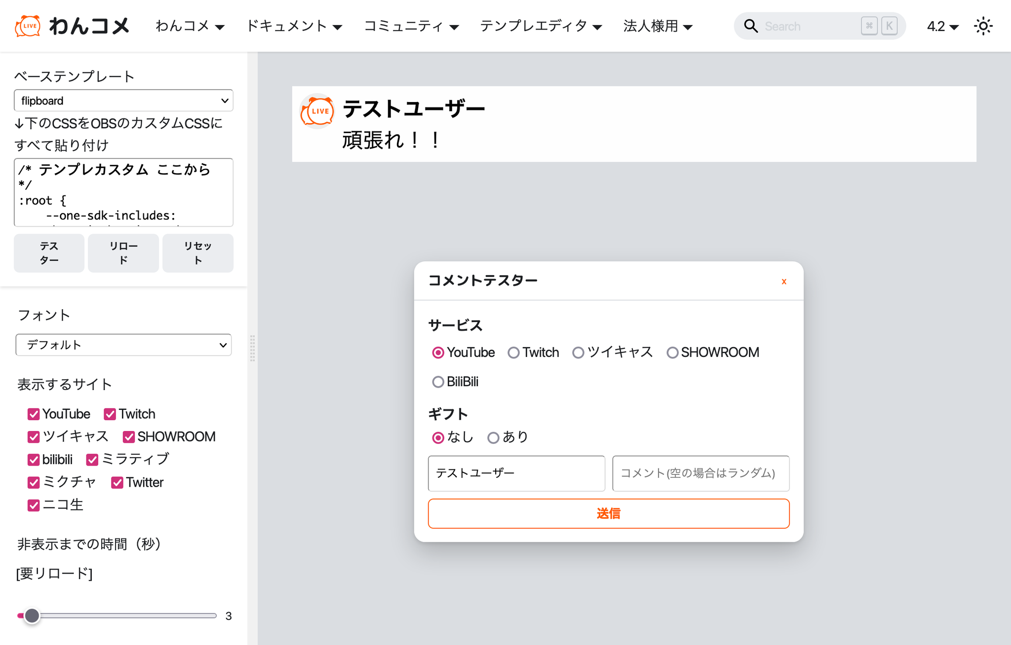 シミュレートするサービスやギフトの有無など設定し、ユーザー名・コメントを入力して送信すると、テンプレートプレビューにコメントが追加されます(コメントを空で送信するとランダムなコメントが追加されます)