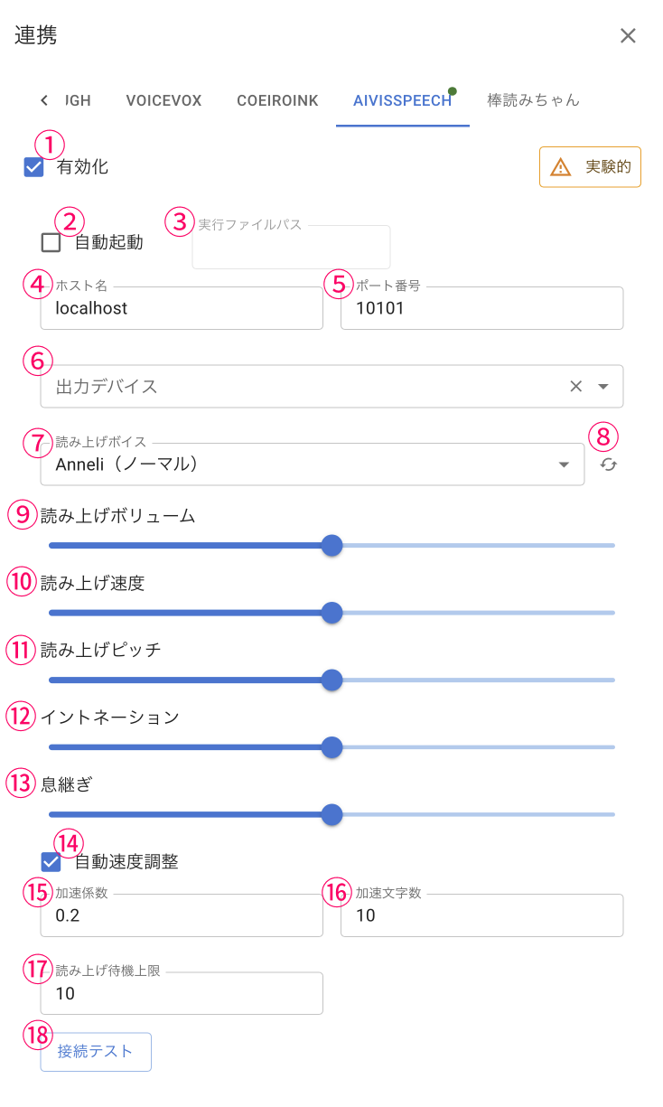 AivisSpeech連携時には設定 > 読み上げの下図赤枠の設定項目は機能しなくなります
