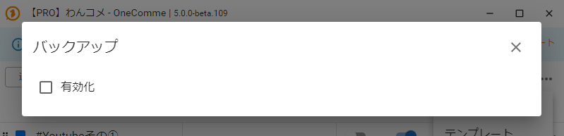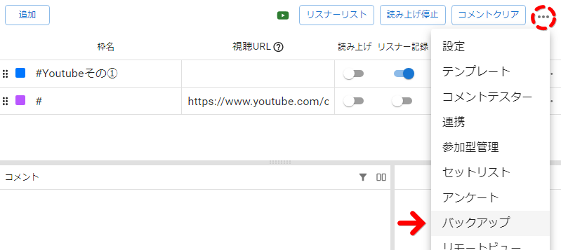 わんコメ右上メニュー「・・・」の「バックアップ」からバックアップの設定画面(下図2枚目)を表示します