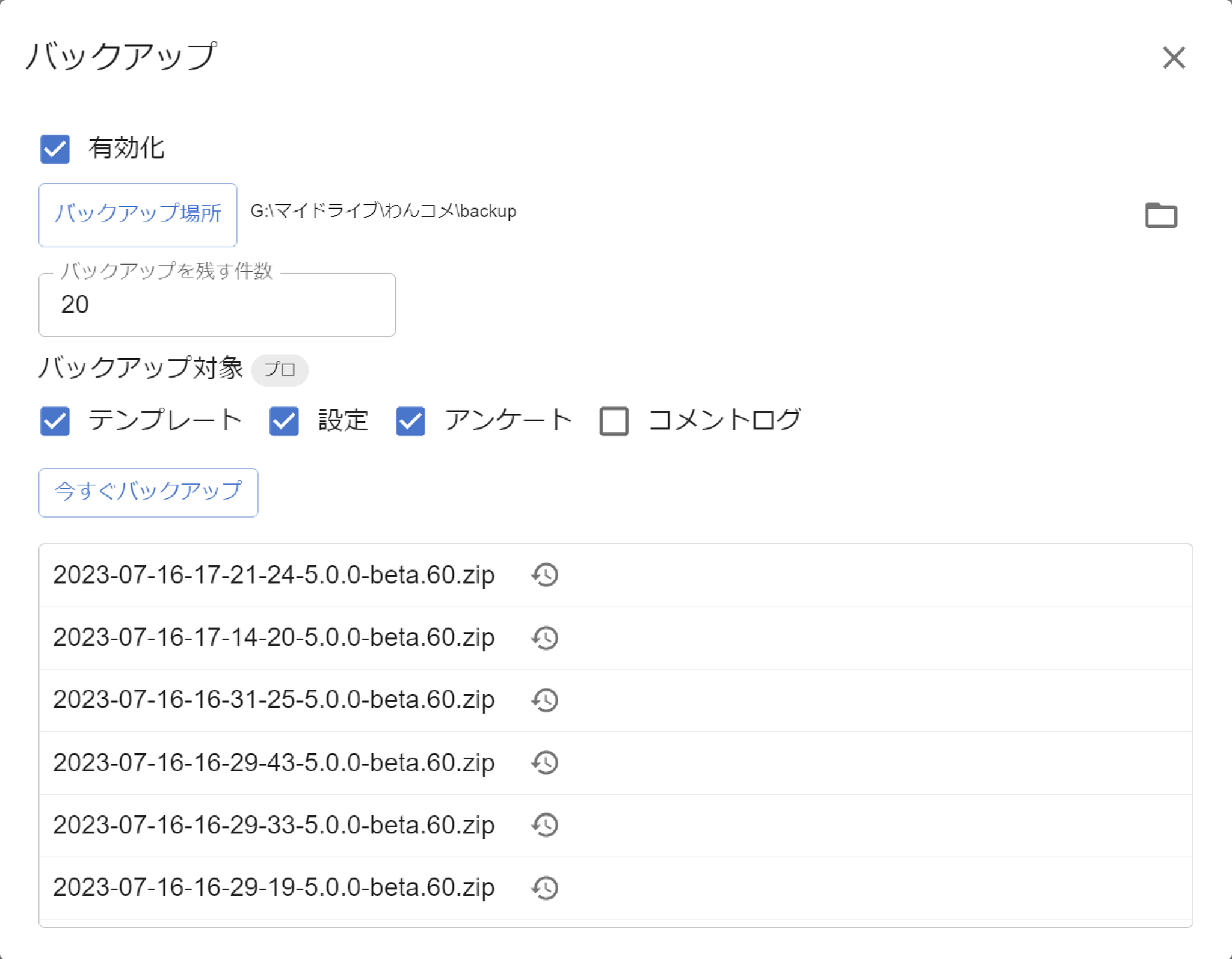 今すぐバックアップ自動バックアップを待たずにその場でバックアップファイルを作成できます