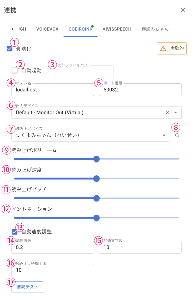 ⑤ポート番号COEIROINKのローカルHTTPサーバーのポート番号(基本変更不要)