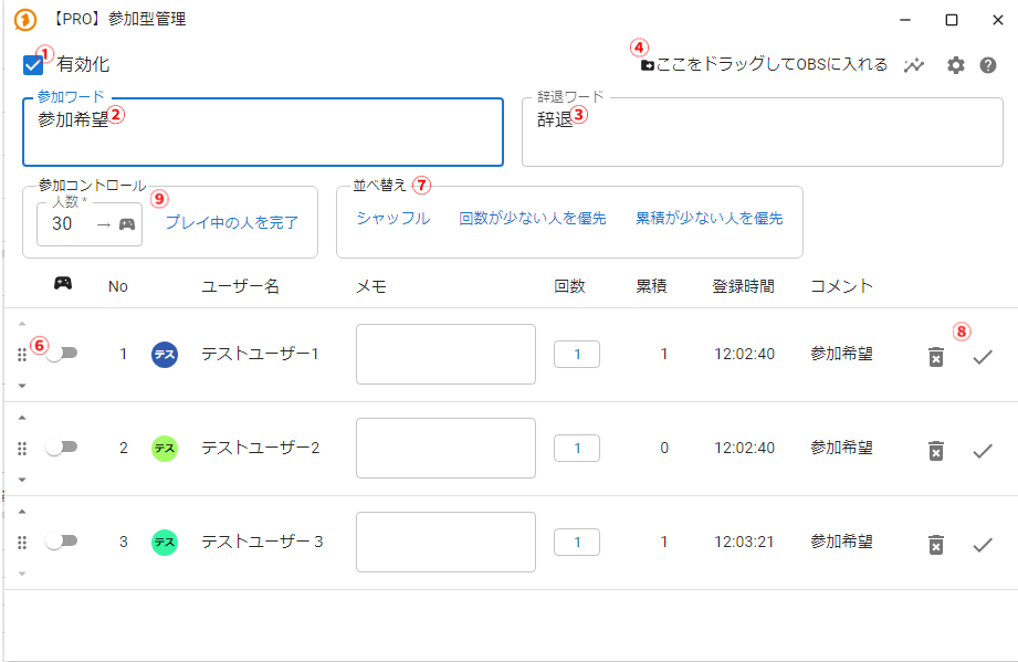9. 参加コントロールの「人数」に一括でプレイ中にしたい人数を入力し「🎮アイコン」で入力した人数をプレイ中にすることができます