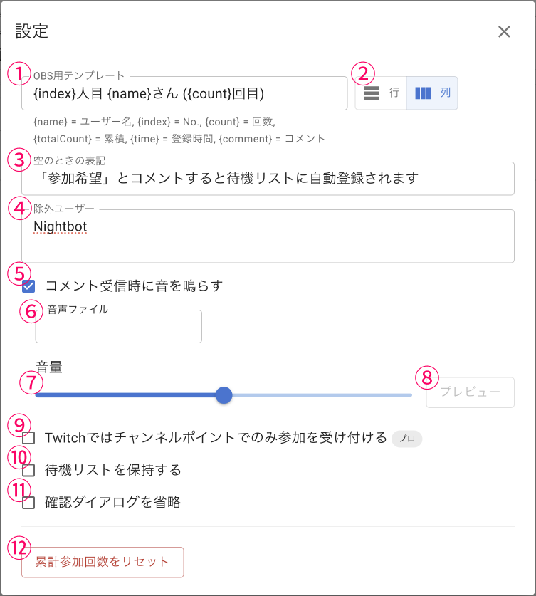 ⑦音量参加コメント受信時に鳴らす効果音の音量調整ができます