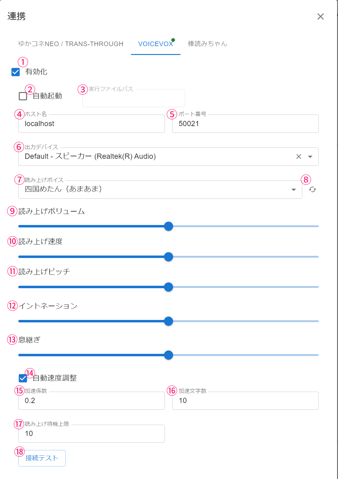 ボイス選択し「接続テスト」をクリックして読み上げされれば連携完了です