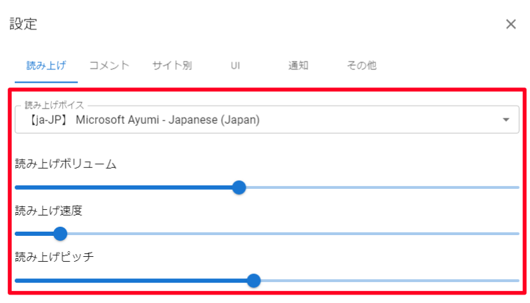 VOICEVOX連携時には設定 > 読み上げの下図赤枠の設定項目は機能しなくなります