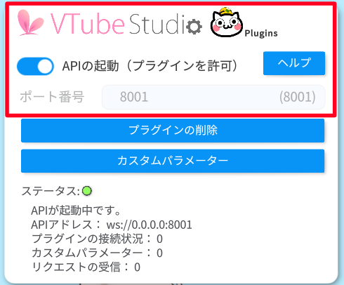※ 異なっている場合は8001ポートを使用しているアプリケーションを終了してからVTubeStudioを起動してください