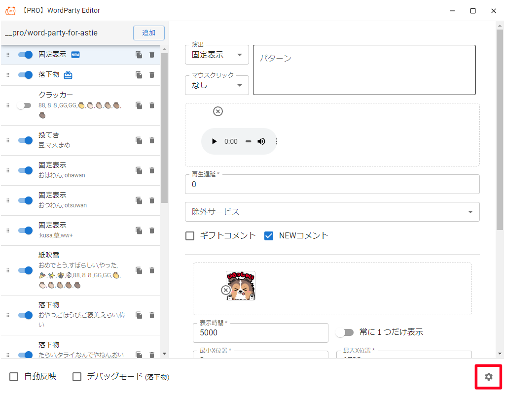 テンプレートからWordPartyエディタを開き、右下にある歯車アイコンをクリックします