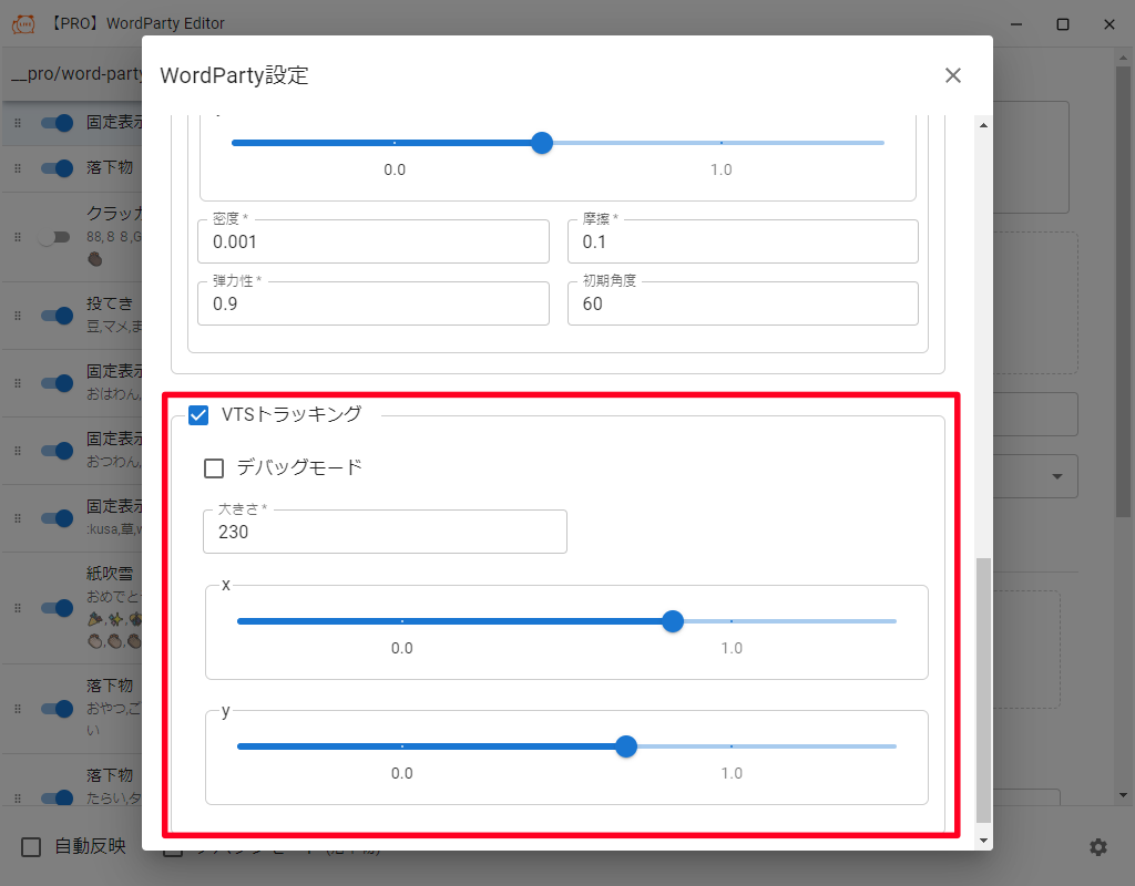 わんコメ4.2から搭載されたVTubeStudioと連携を使うと、トラッキングに合わせて動く落下物の当たり判定領域を作ることができます