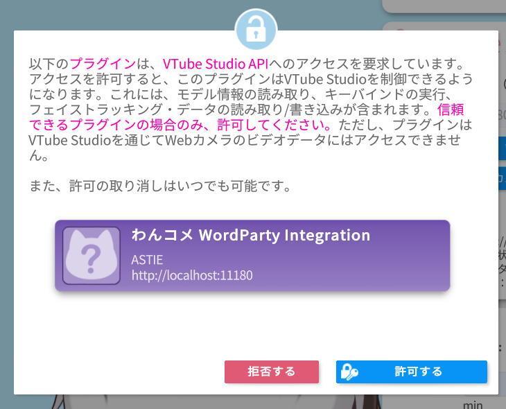 しばらくするとVTubeStudioの画面に以下のようなプラグインの許可確認が表示されますので、「許可する」を選択してください